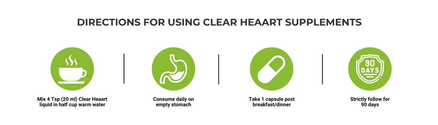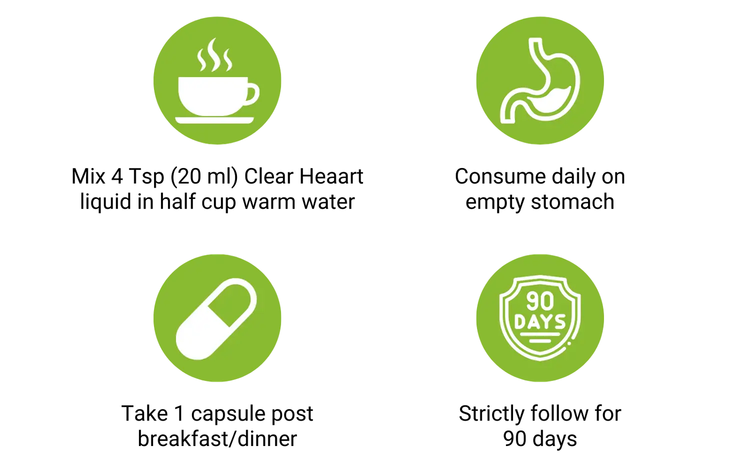 Take a half glass of warm water and mix four teaspoons (20 ML) of Clear Heart liquid. Drink this in the morning daily with an empty stomach. Ensure that you do not consume anything for the next half an hour and take Clear Heart Plus Capsules one after Breakfast and one capsule after dinner every day.