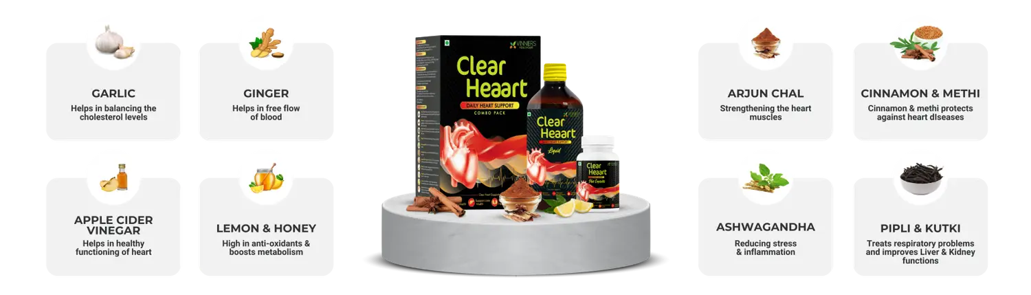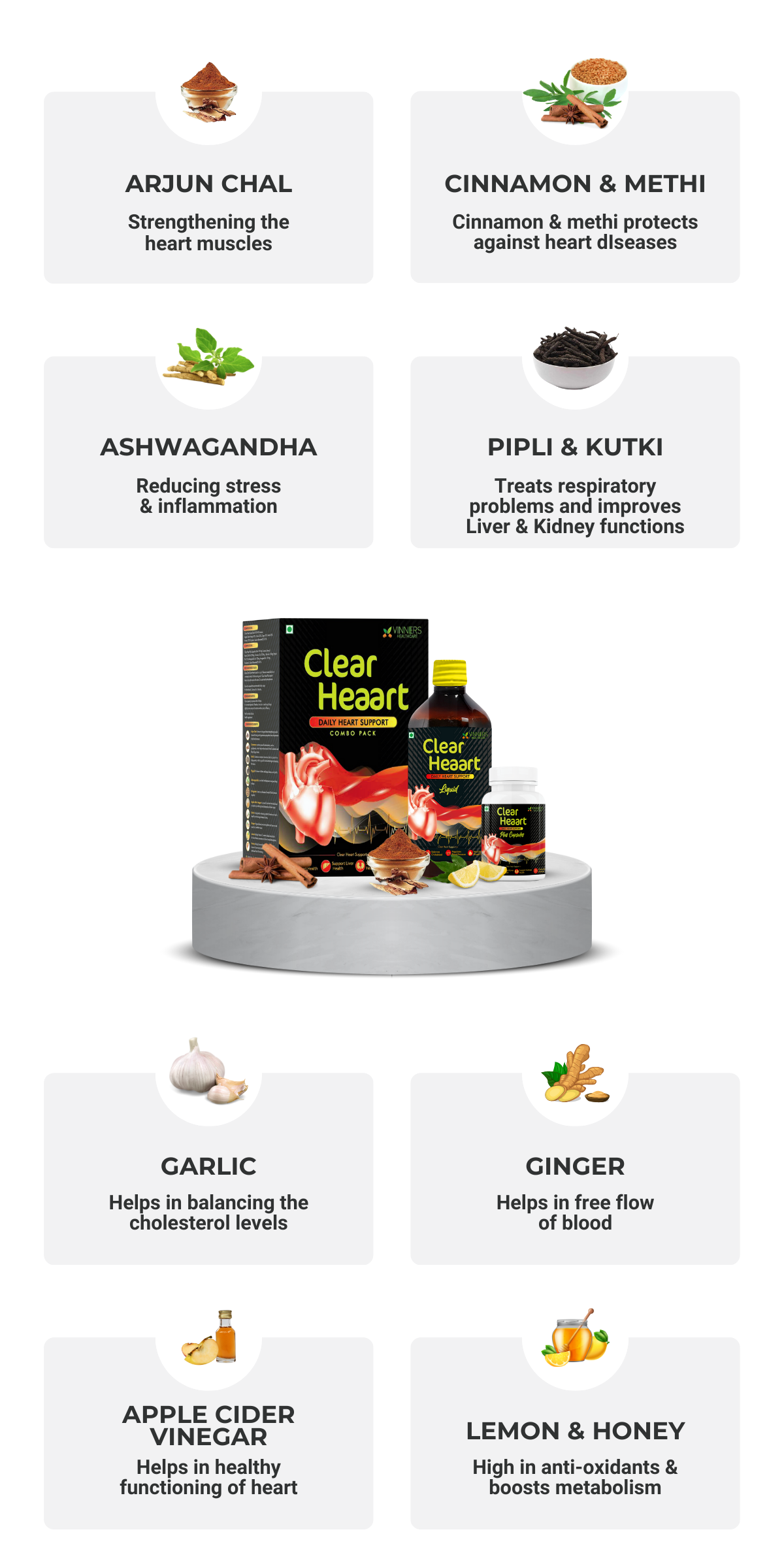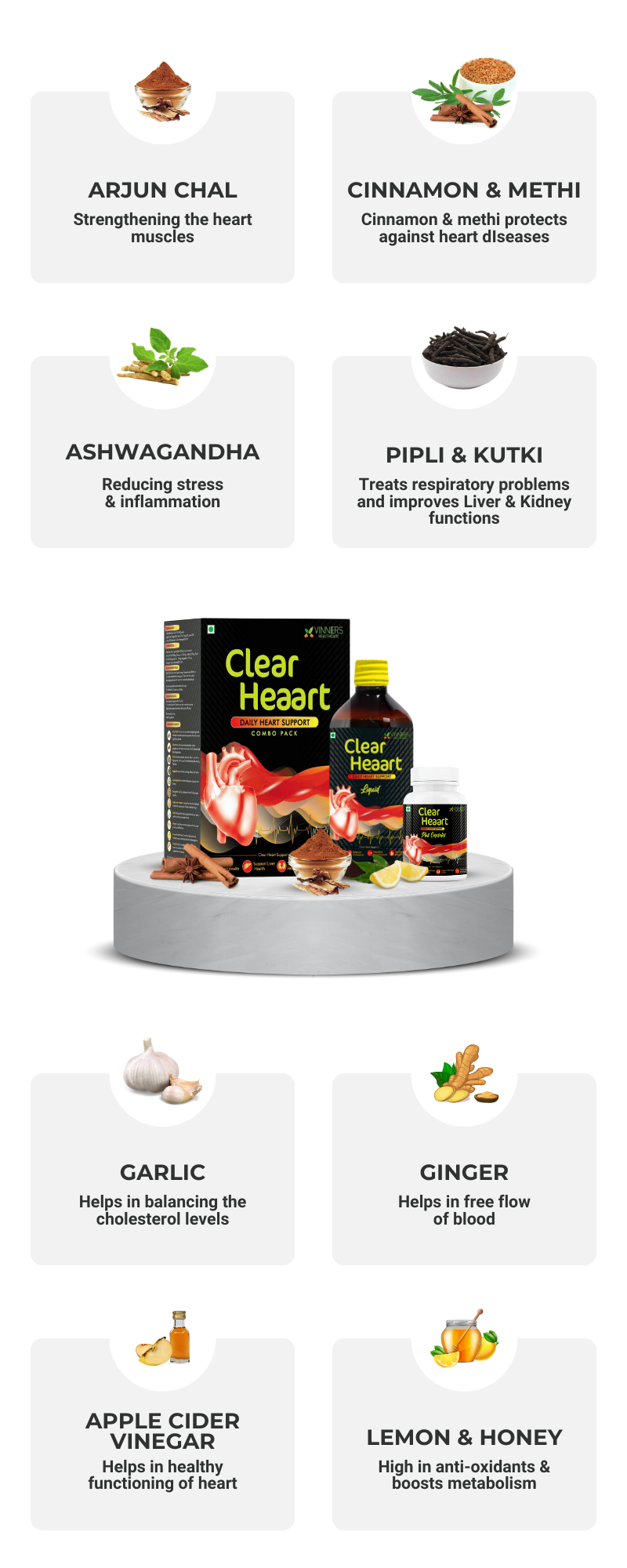 Clear Heaart Combo Pack is a 100% Natural supplement made with all-natural active ingredients like Garlic, Ginger, Lemon, Apple Cider Vinegar, Honey, Arjun Chal, Cinnamon, Kutki, Pippli, Ashwagandha, and Methi Extract, which helps support a holistic Heart, Liver and Kidneys health with many other benefits.